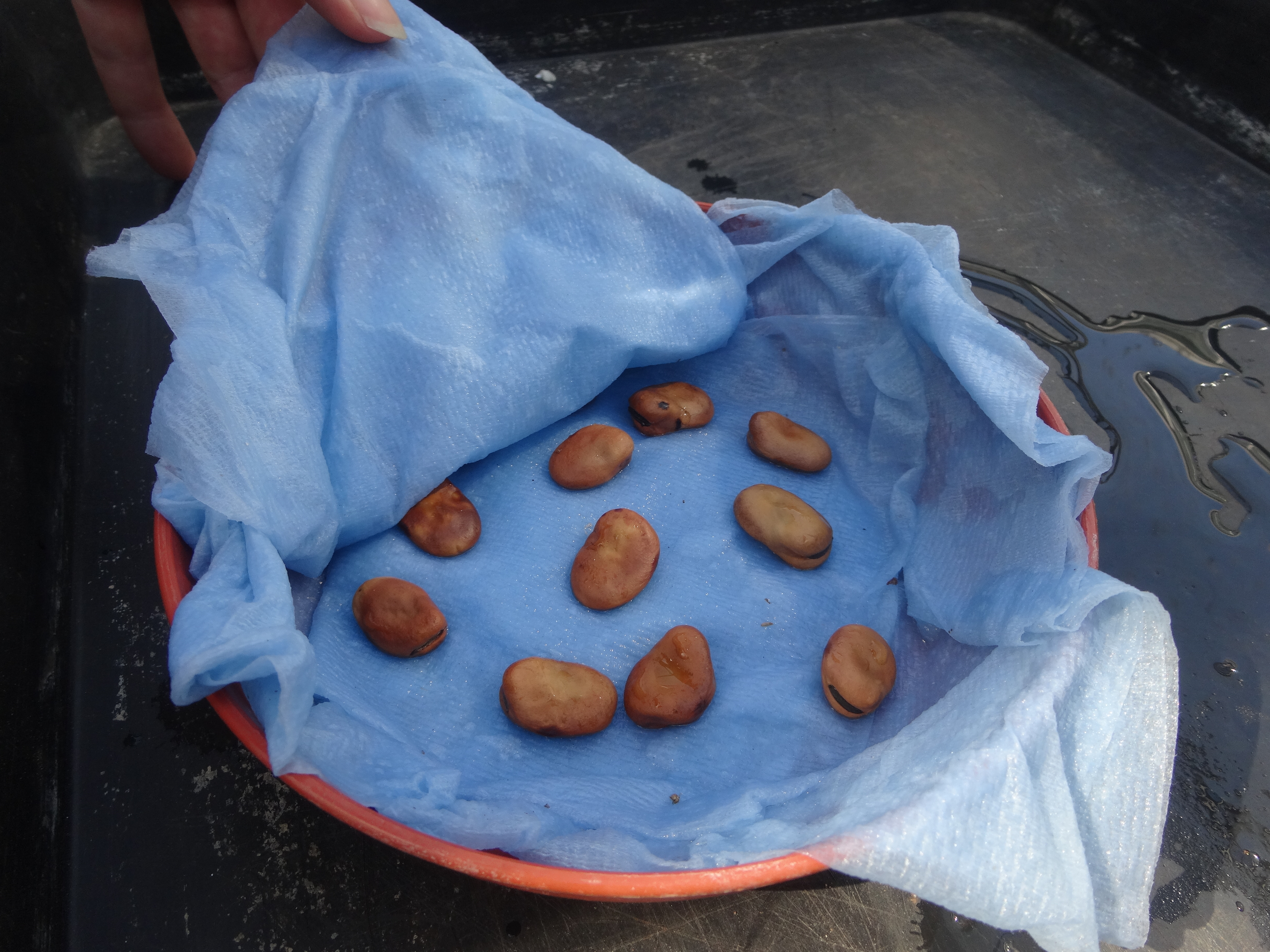 If you've had to start already, don't worry - you'll only be a little bit ahead and other plants will catch up. My beans are safely ensconced in their dish on the shelf, so should start sprouting soon - here they are: